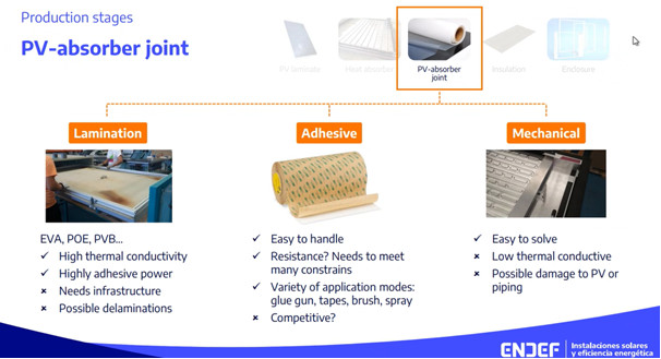 PVT collectors typically rely on one of three connection technologies: lamination, gluing, or mechanical clamping. Dr. Raquel Simón, R&D Engineer from Endef, Spain, presented an overview of the PV-absorber joining processes with their advantages and disadvantages (see figure 2). Lamination offers the highest thermal conductivity but can also create stress in the PV cells due to differences in thermal expansion between materials.